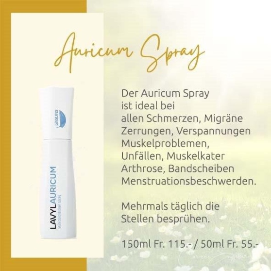 Lavyl Auricum enthält Alkohol (Kolloide) und eignet sich für die äussere Anwendung von nicht so empfindlichen Hautflächen. Durch die Kolloide bleibt die Wirkung mehr lokal und geht vor allem auch viel mehr in die Tiefe, d.h. die Zellen werden bis in die Knochen hinein erreicht und aufgeschlossen. Hoher Goldanteil (entzündungshemmend).