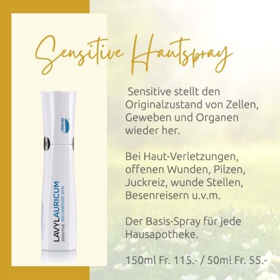 Lavyl Auricum Sensitive hat im Gegensatz zum „normalen“ Auricum keinen kolloidalen Alkohol und wirkt von daher mehr an der Oberfläche, d.h. auf der Haut. Der Sensitive ist ideal bei offenen Wunden, für empfindliche Hautpartien wie z.B. das Gesicht, auf Schleimhäuten, im Intimbereich und auch für die zarte Babyhaut. Bei Ekzemen, Neurodermitis, Hautausschlägen, Augenproblemen (kann auf die geschlossenen Augenlider gesprüht werden). Auch bei Stress/Anspannung oder zur Raumreinigung und –energetisierung.