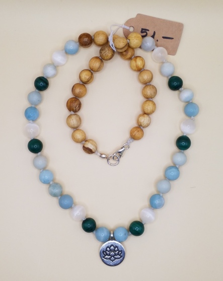 Halskette mit Palosanto sowie Malachit, Selenit, Amazonit & Amazonit Crunchy